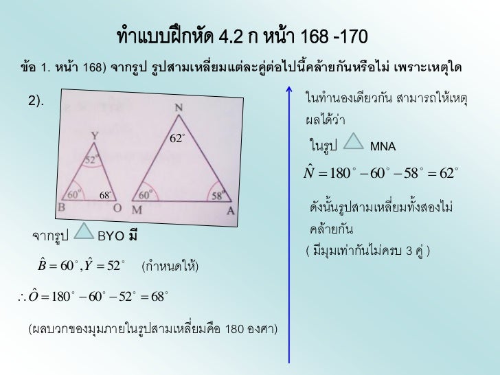 - 11. ข้อ 1. หน้า 168) จากรูป รูปสามเหลี่ยมแต่ละคู่ต่อไปนี้คล้ายกันหรือไม่ เพราะเหตุใด 2). ในทานองเดียวกัน สามารถให้เหตุ ผลได้ว่า 62 ในรูป MNA ˆ N 180 60 58 62 68 ดังนั้นรูปสามเหลียมทั้งสองไม่ ่ จากรูป BYO มี คล้ายกัน ( มีมุมเท่ากันไม่ครบ 3 คู่ ) ˆ ˆ B 60 , Y 52 (กาหนดให้) ˆO 180 60 52 68 (ผลบวกของมุมภายในรูปสามเหลียมคือ 180 องศา) ่