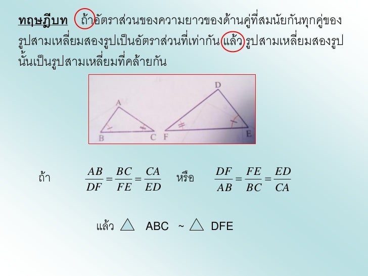 - 12. ทฤษฎีบท ถ้าอัตราส่วนของความยาวของด้านคู่ที่สมนัยกันทุกคู่ของรูปสามเหลี่ยมสองรูปเป็นอัตราส่วนที่เท่ากัน แล้ว รูปสามเหลี่ยมสองรูปนั้นเป็นรูปสามเหลี่ยมที่คล้ายกัน AB BC CA DF FE ED ถ้า หรือ DF FE ED AB BC CA แล้ว ABC ~ DFE