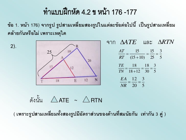 - 13. ข้อ 1. หน้า 176) จากรูป รูปสามเหลี่ยมสองรูปในแต่ละข้อต่อไปนี้ เป็นรูปสามเหลี่ยมคล้ายกันหรือไม่ เพราะเหตุใด 2). จาก ATE และ RTN 25 AT 15 15 3 RT (15 10 ) 25 5 TE 18 18 3 TN 18 12 30 5 EA 12 3 NR 20 5 ดังนั้น ATE ~ RTN ( เพราะรูปสามเหลี่ยมทั้งสองรูปมีอัตราส่วนของด้านที่สมนัยกัน เท่ากัน 3 คู่ )