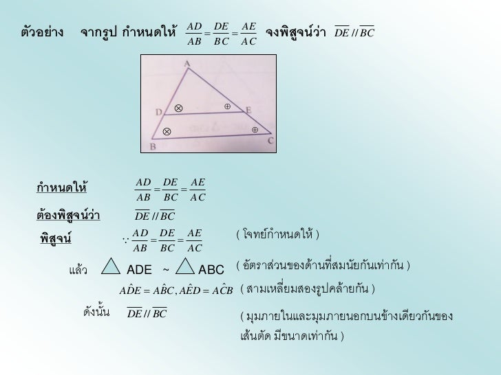 - 14. ตัวอย่าง จากรูป กาหนดให้ AD DE AE AB BC AC จงพิสจน์ว่า ู DE // BC กาหนดให้ AD DE AE AB BC AC ต้องพิสูจน์ว่า DE // BC พิสูจน์ AD DE AE ( โจทย์กาหนดให้ ) AB BC AC แล้ว ADE ~ ABC( อัตราส่วนของด้านที่สมนัยกันเท่ากัน ) ADE ABC , AED ACB ( สามเหลี่ยมสองรูปคล้ายกัน ) ˆ ˆ ˆ ˆ ดังนั้น DE // BC ( มุมภายในและมุมภายนอกบนข้างเดียวกันของ เส้นตัด มีขนาดเท่ากัน )