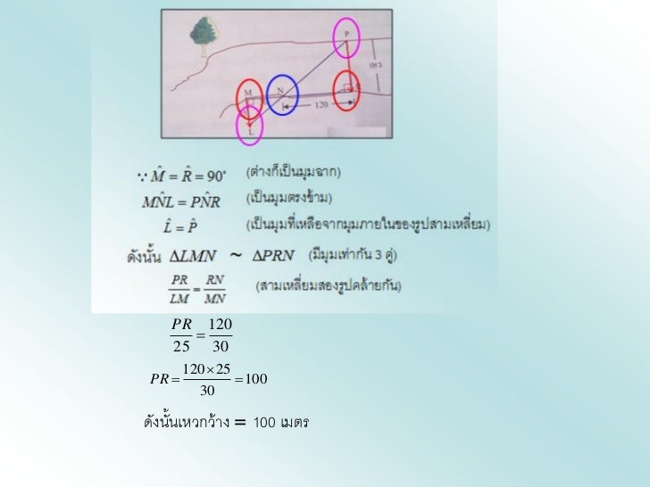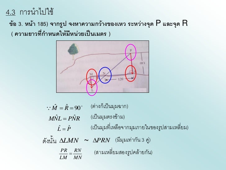 - 15. 4.3 การนาไปใช้ ข้อ 3. หน้า 185) จากรูป จงหาความกว้างของเหว ระหว่างจุด P และจุด R ( ความยาวที่กาหนดให้มหน่วยเป็นเมตร ) ี ˆ ˆ M R 90 (ต่างก็เป็นมุมฉาก) ˆ ˆ MNL PNR (เป็นมุมตรงข้าม) ˆ ˆ LP (เป็นมุมที่เหลือจากมุมภายในของรูปสามเหลี่ยม) ดังนั้น LMN ~ PRN (มีมมเท่ากัน 3 คู) ุ ่ PR RN (สามเหลี่ยมสองรูปคล้ายกัน) LM MN