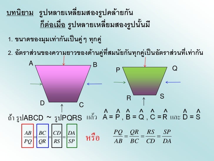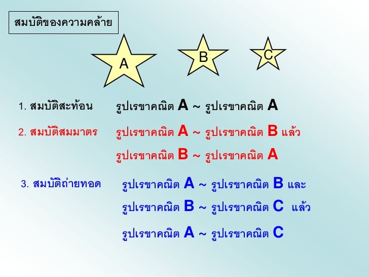 - 1. รูปเรขาคณิตสองรูปเป็นรูปที่คล้ายกัน เมื่อรูปเรขาคณิต ทั้งสองนั้นมีรูปร่างเหมือนกัน เช่น รูป A กับรูป B รูป A รูป B หรือ รูป B รูป Aใช้สัญลักษณ์ รูป A ~ รูป B อ่านว่า รูป A คล้ายกับรูป B