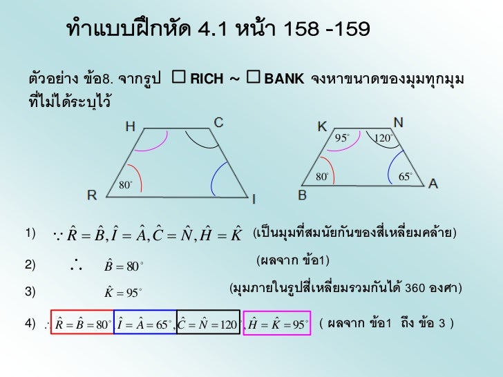 - 5. ตัวอย่าง ข้อ8. จากรูป RICH ~ BANK จงหาขนาดของมุมทุกมุมที่ไม่ได้ระบุไว้ 95 120 80 65 801) ˆ ˆ ˆ ˆ ˆ ˆ ˆ ˆ R B, I A, C N , H K (เป็นมุมที่สมนัยกันของสีเหลี่ยมคล้าย) ่2) ˆ B 80 (ผลจาก ข้อ1)3) ˆ K 95 (มุมภายในรูปสีเหลี่ยมรวมกันได้ 360 องศา) ่ ˆ ˆ ˆ ˆ ˆ ˆ ˆ ˆ4) R B 80 , I A 65 , C N 120 , H K 95 ( ผลจาก ข้อ1 ถึง ข้อ 3 )