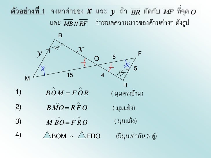 - 7. และ MB // RF กาหนดความยาวของด้านต่างๆ ดังรูป B y x F O 6 5 15 4 M R1) BO M F O R ( มุมตรงข้าม) 2) B MO R F O ( มุมแย้ง) 3) M BO F R O ( มุมแย้ง)4) BOM ~ FRO (มีมมเท่ากัน 3 คู) ุ ่