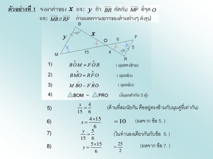 - 8. x 45) (ด้านที่สมนัยกัน คืออยู่ตรงข้ามกับมุมคู่ที่เท่ากัน) 15 66) x 415 10 (ผลจาก ข้อ 5. ) 6 y 57) (ในทานองเดียวกันกับข้อ 5. ) 15 68) y 515 25 (ผลจาก ข้อ 7. ) 6 2