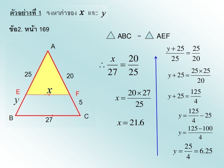 - 9. ข้อ2. หน้า 169 ABC ~ AEF y 25 25 x 20 25 20 27 25 25 25 y 25 20 20 27 125 x y 25 25 4 125 y 25 x 21.6 4 125 100 y 4 25 y 6.25 4